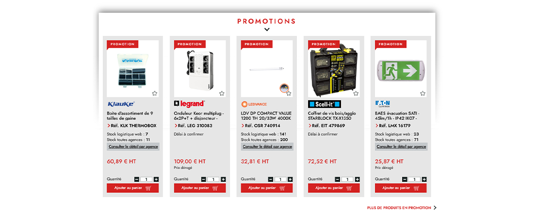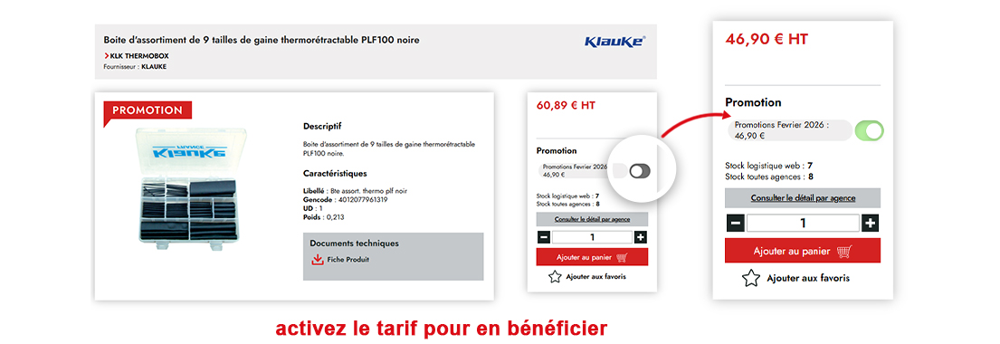 Nos promotions sont désormais accessibles directement sur notre site. Pour en profiter, il vous suffit de vous rendre sur la fiche d'une référence concernée et d’activer le tarif promotionnel. Le prix remisé s’applique immédiatement.
